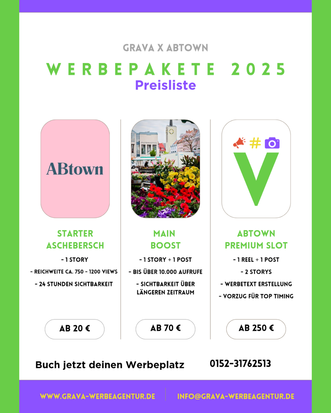 ABtown ist eine gefestigte Community aus Menschen im Raum Aschaffenburg. Vertreten auf Instagram sowie Facebook. Die unten genannten Preise beziehen sich auf Werbung auf Instagram, aktuell ist die die Zubuchung von Werbung auf Facebook kostenlos. Aktuelle Zahlen erhalten sie auf Anfrage.